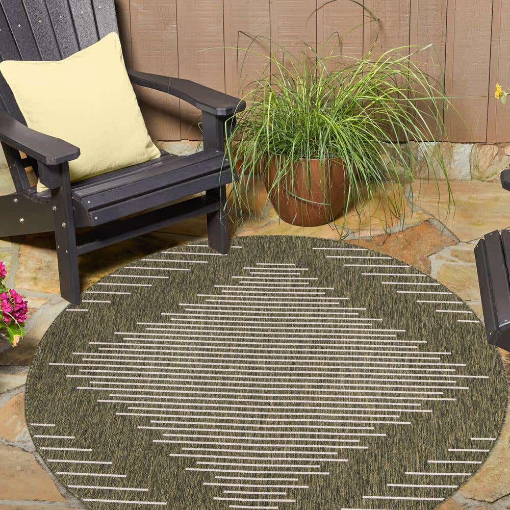 Modernes Design: Der Tulum Teppich zeichnet sich durch ein wiederkehrendes Muster aus miteinander verbundenen Diamantformen aus, das auf einem dunklen Hintergrund für Kontrast und visuelles Interesse sorgt. Dieses Design verleiht dem Teppich einen zeitgemäßen und stilvollen Look, der jede Outdoor-Einstellung ergänzt.